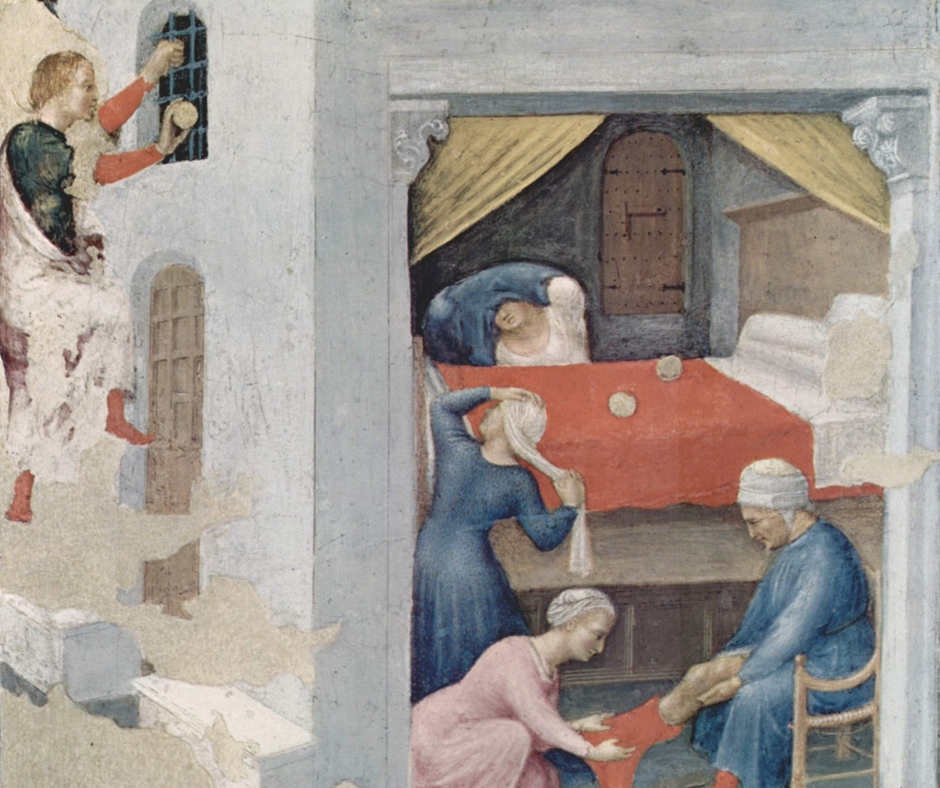Gentile da Fabriano, ca. 1425: Nicolaas gooit gouden munten in de kamer van de drie zussen die als prostituee moeten werken.